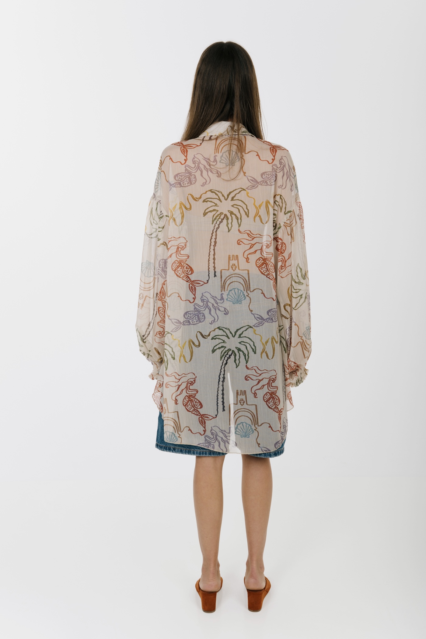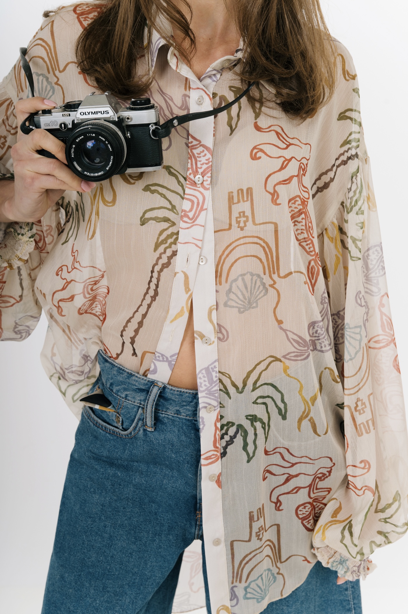 Αέρινο, δροσερό και άνετο πουκάμισο τουνίκ με ζωγραφισμένο σε καμβά print σε αφηρημένη τέχνη, σχεδιασμένο για effortless chic εμφανίσεις. Η πουκαμίσα συνδυάζει τη μοναδική αίσθηση που προφέρει το μεταξωτό σιφόν ύφασμα στην ύφανση και με ένα τολμηρό και ταυτόχρονα μινιμαλιστικό preppy style με γιακά. Στο φαρδύ εμπριμέ γυναικείο πουκάμισο αποκαλύπτεται το σχεδιασμένο με το χέρι print των KNLs, εμπνευσμένο από τη ρετρό διακόσμηση εσωτερικού χώρου. Είναι ημιδιάφανο, έχει φαρδιά μανίκια και θα το χαρείς με πολλούς τρόπους. Μπορείς να το φορέσεις με σορτς, τζιν και ασφαλώς μόνο του με το μαγιό σου. Από τις πουκαμίσες τουνίκ που ξεχωρίζουν, είναι one size και ταιριάζει σε κάθε σωματότυπο. Θα τη λατρέψεις! Αφέσου...δε χρειάζεται να είσαι τέλεια!