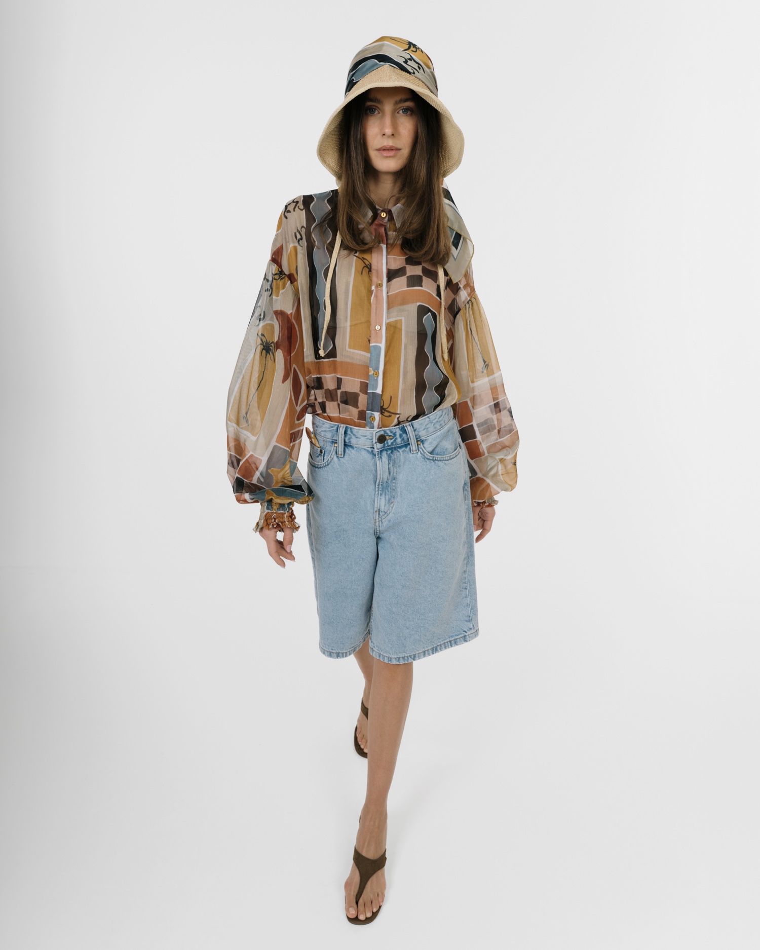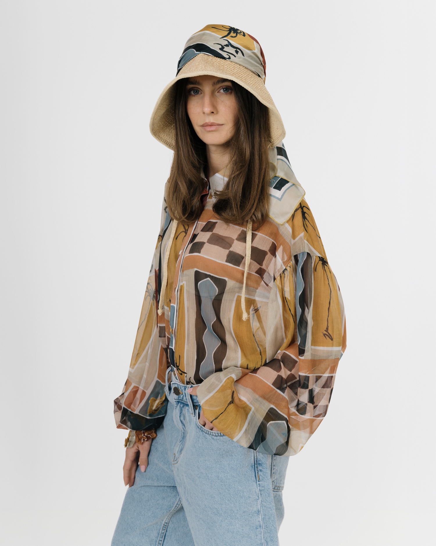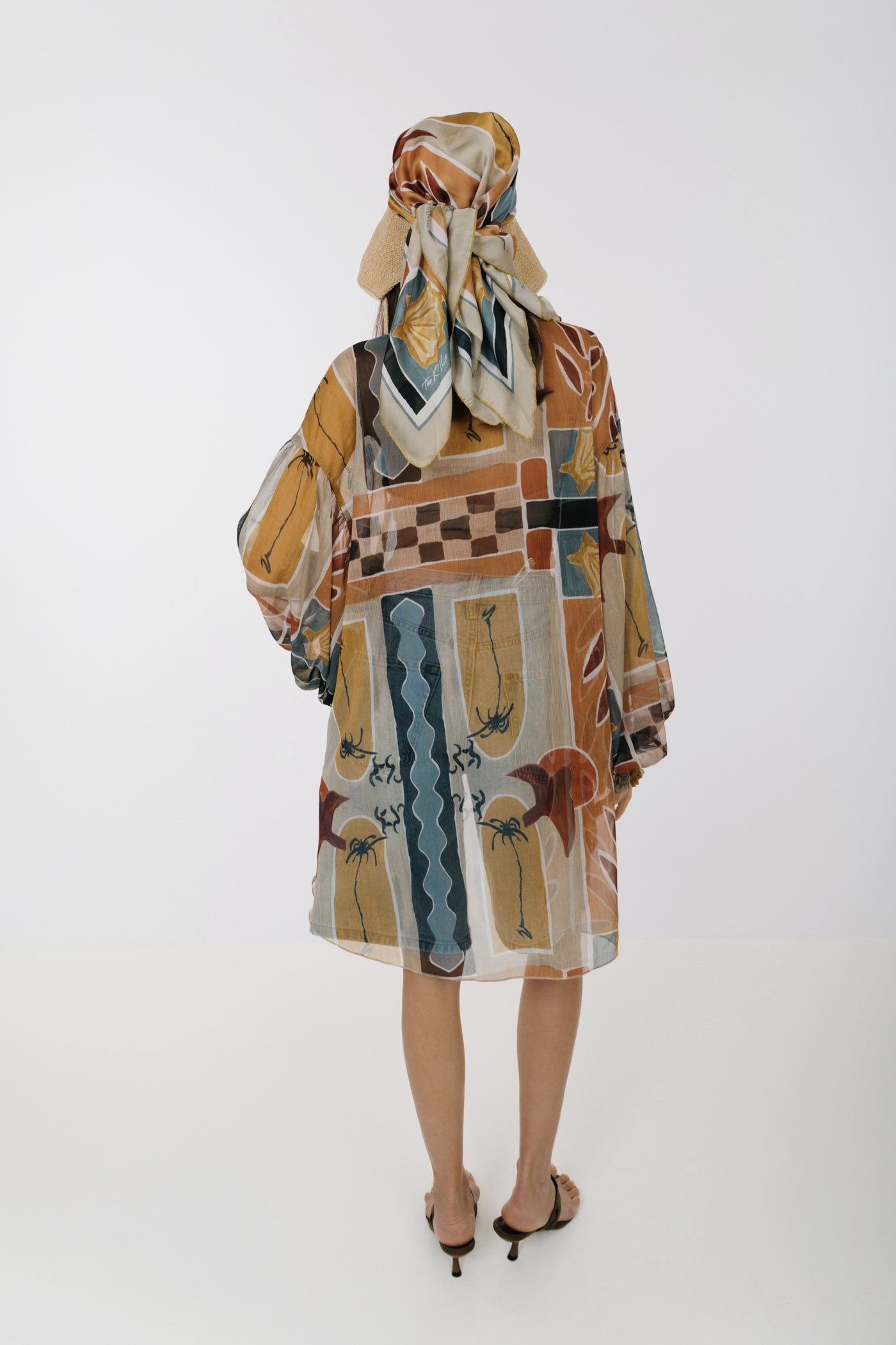 Αέρινο, δροσερό και άνετο πουκάμισο τουνίκ με ζωγραφισμένο σε καμβά print σε αφηρημένη τέχνη, σχεδιασμένο για effortless chic εμφανίσεις. Η πουκαμίσα συνδυάζει τη μοναδική αίσθηση που προφέρει το μεταξωτό σιφόν ύφασμα στην ύφανση και με ένα τολμηρό και ταυτόχρονα μινιμαλιστικό preppy style με γιακά. Στο φαρδύ εμπριμέ γυναικείο πουκάμισο αποκαλύπτεται το σχεδιασμένο με το χέρι print των KNLs, εμπνευσμένο από τη ρετρό διακόσμηση εσωτερικού χώρου. Είναι ημιδιάφανο, έχει φαρδιά μανίκια και θα το χαρείς με πολλούς τρόπους. Μπορείς να το φορέσεις με σορτς, τζιν και ασφαλώς μόνο του με το μαγιό σου. Από τις πουκαμίσες τουνίκ που ξεχωρίζουν, είναι one size και ταιριάζει σε κάθε σωματότυπο. Θα τη λατρέψεις! Αφέσου...δε χρειάζεται να είσαι τέλεια!