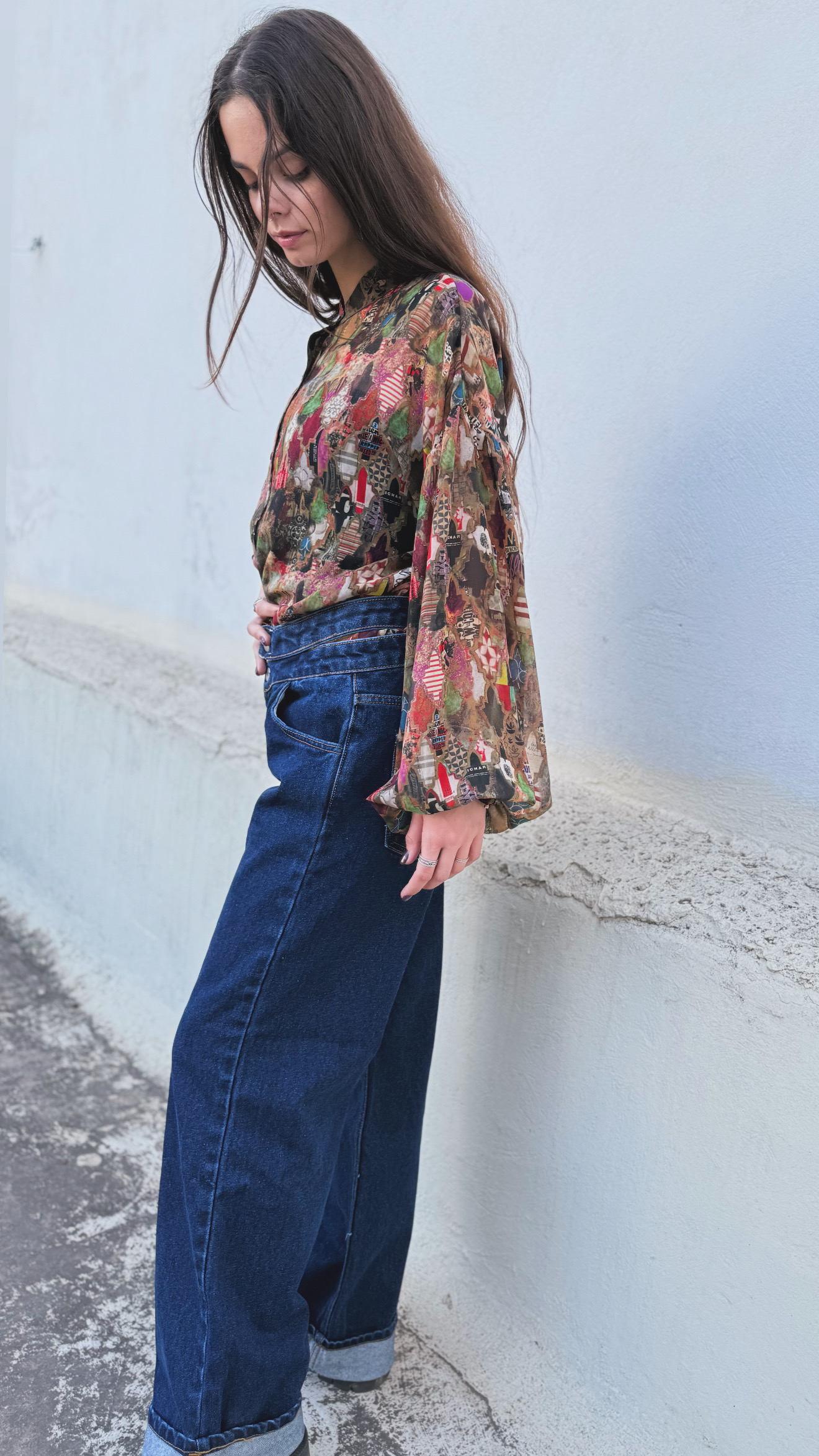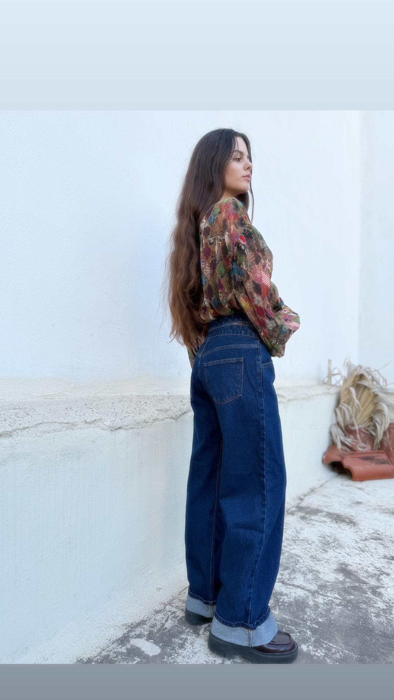 Meet our BOUNDLE wide legs women's blue jeans! A double-belted and convertible slung blue black wash denim that stands out. The new age hight rise relaxed fit jeans are designed for a slouchy, baggy fit with references to 90's style. They have side cutouts at the high-rise waistband version that bares a flash of skin or can be converted to mid-rise when the waistband is reversed showing the logo inside. The mid-rise option is trending leaving the top belt open to show the handmade logo band outside! They're made from thick denim which feels super stable and soft from the first wear and fit throughout the legs. Made in Greece of pure cotton, it's so easy to wear and super comfy. Match it with any top or a bodysuit if you prefer.