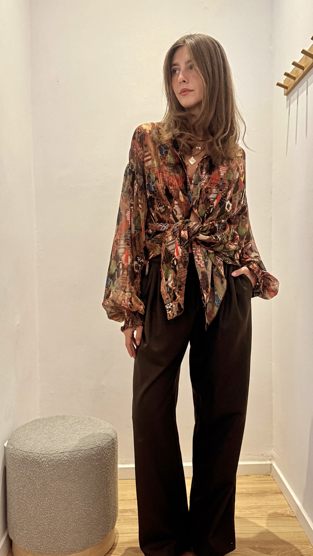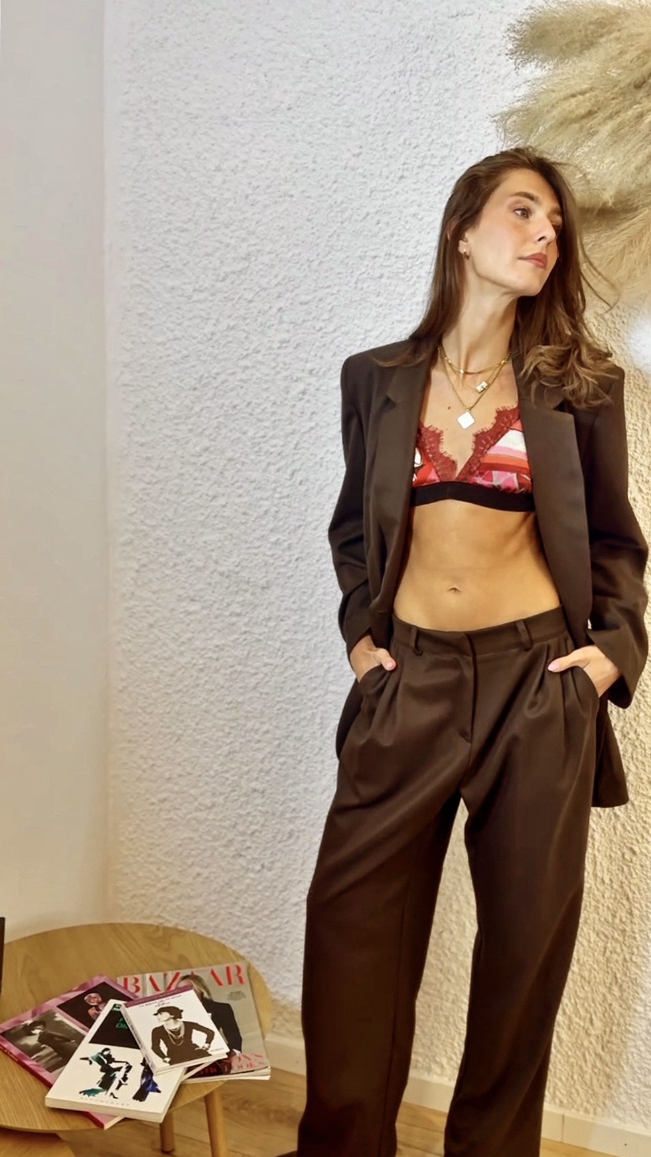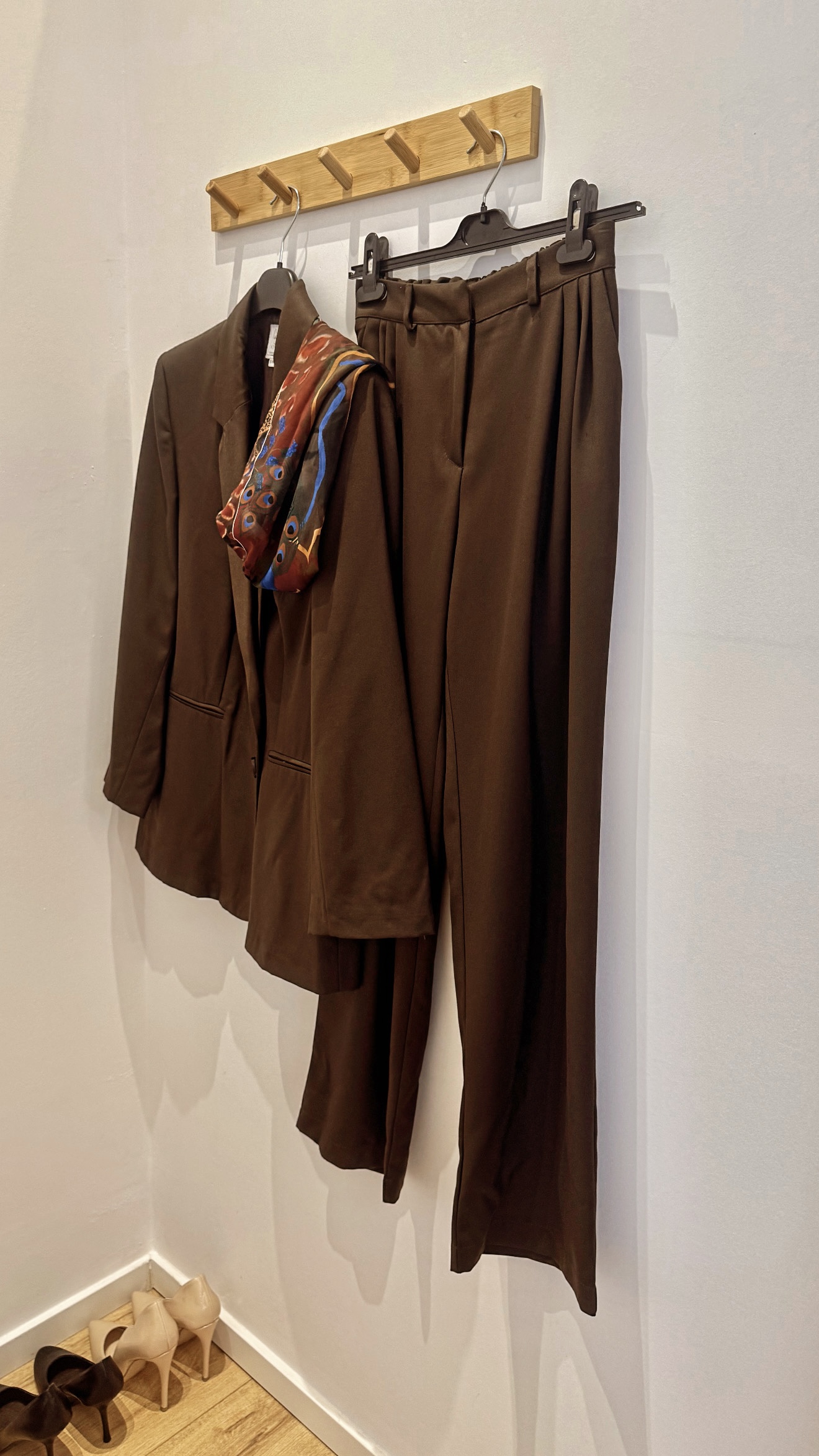 Relate with dark chocolate brown straight leg pants in wool blend and loose fit with pleats. They feel like the most comfortable garment, just like sweatpants and can fit to any body-type. They come in 2 sizes for perfect fit, in bold color, they have a relaxed shape, high-waisted fit, flattering every body figure. Made from fine textured cool wool and cotton, the high-rise trousers have an elastic belt on the back, a front button and side pleats on the upper leg part. They are loose on the bottom and straight leg, with side pockets. Try it with matching Soulmate blazer and Eros shirt.
