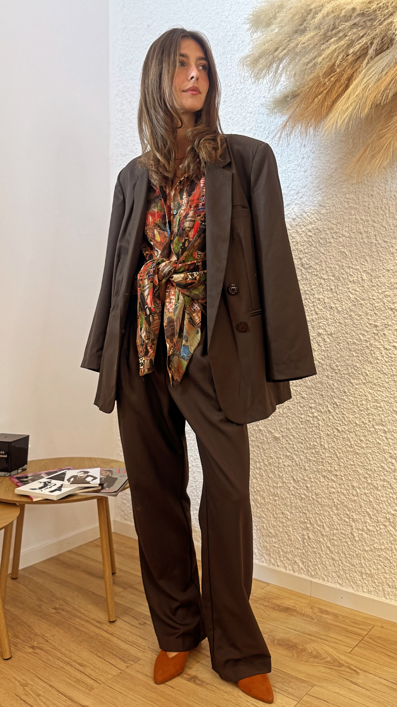 You can find your Soulmate, this wool blend blazer in dark chocolate color is incredibly versatile. Italian fabric from lightly structured wool blend, it is oversized, has padded shoulders for subtle structure, is long enough to cover your hips and it stands out as The KNLs signature quality and fit for power dressing in Suits . It has been tailored for a long, relaxed, oversized, boyfriend shape, but it keeps being feminine due to slightly slim waist. Style yours with Relate pants, jeans for a casual edge or dress it up to tailoring as a suit.