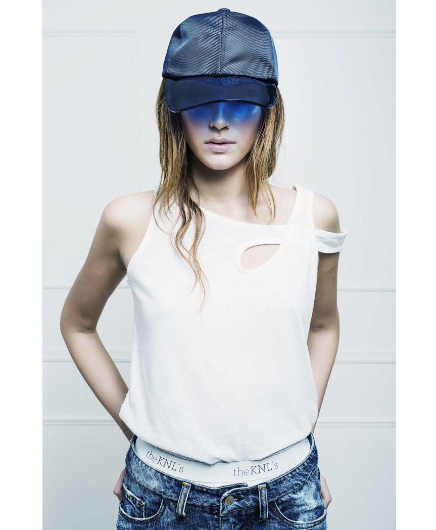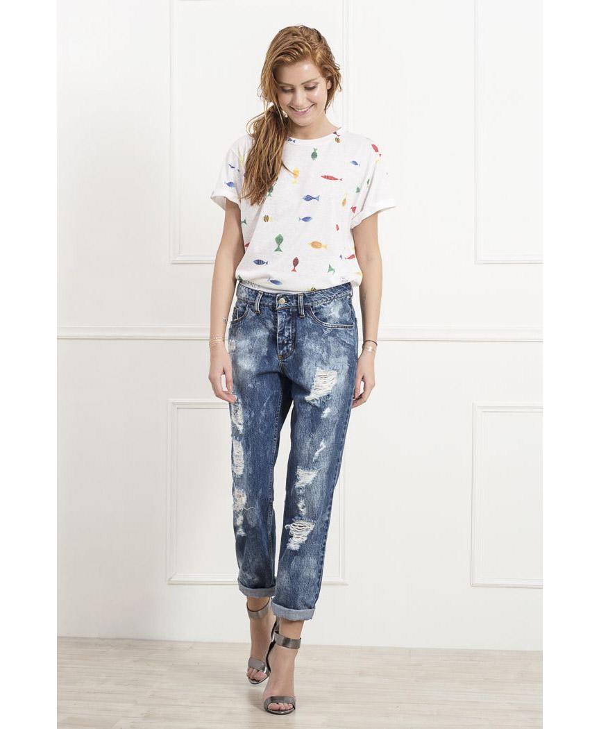 Bluegill jeans are mid-rise distressed for a rough-and-tumble look. This pair is cut for a slim boyfriend fit, with loosely tapered legs and rolled cuffs and elasticated waistband for perfect fit either high or low-waist. The elasticated band is the digital printed with The KNLs logo. Its made of pure Italian cotton and can be worn with the Tinca top or the Spook top or Swordfish top and your favourite flats or heels.