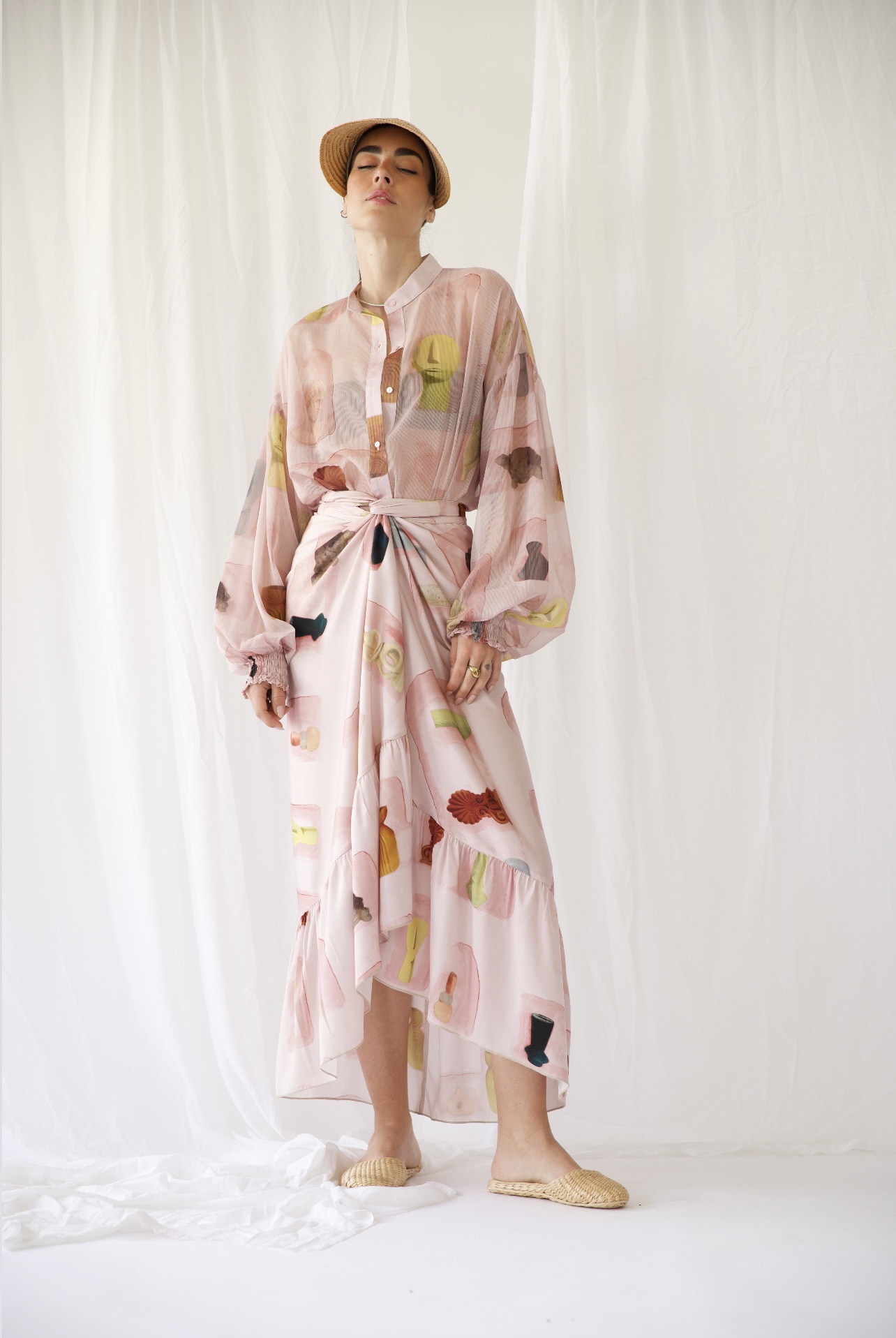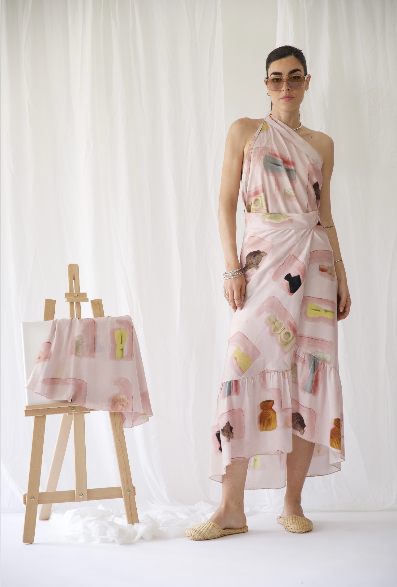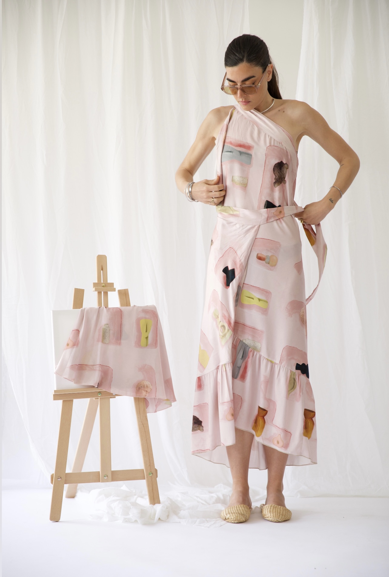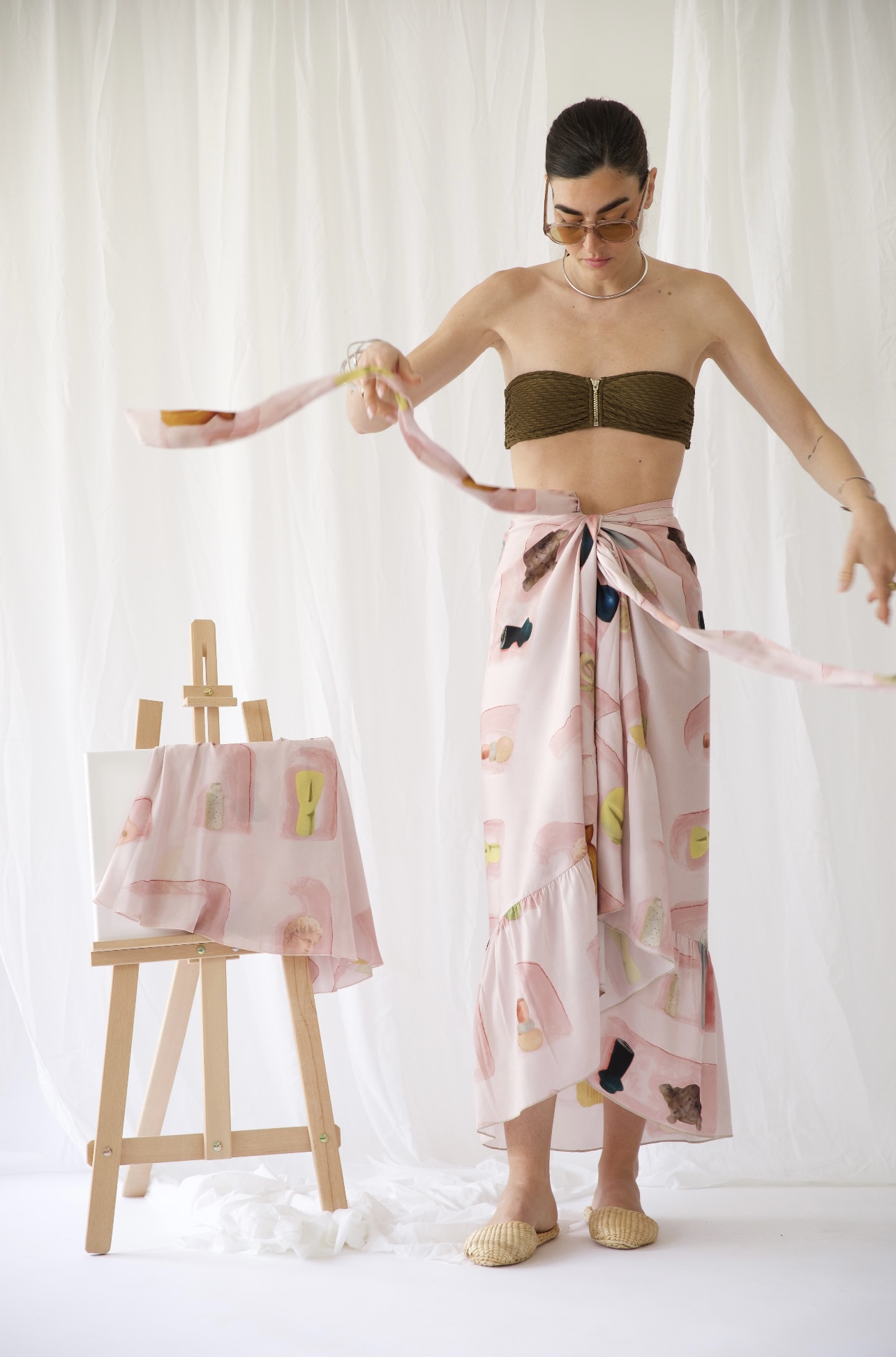 Flow polymorphic and convertible wrap skirt in pale pink wall art, can be easily transformed into an amazing midi dress with one move! There are many ways to wear it, please improvise! Made from a flowy silky satin, has ties on both sides to wrap it around you and a frill on the lower part that gives an extra move to the whole look! The signature print elevates the garment! Wear it as the most disruptive stand-alone dress or with anything from a tank top to a matching shirt or top. Our wardrobes are often divided into “work” and “casual” but The KNLs creates versatile pieces as this convertible skirt that can be worn for both, and a variety of other occasions, too.