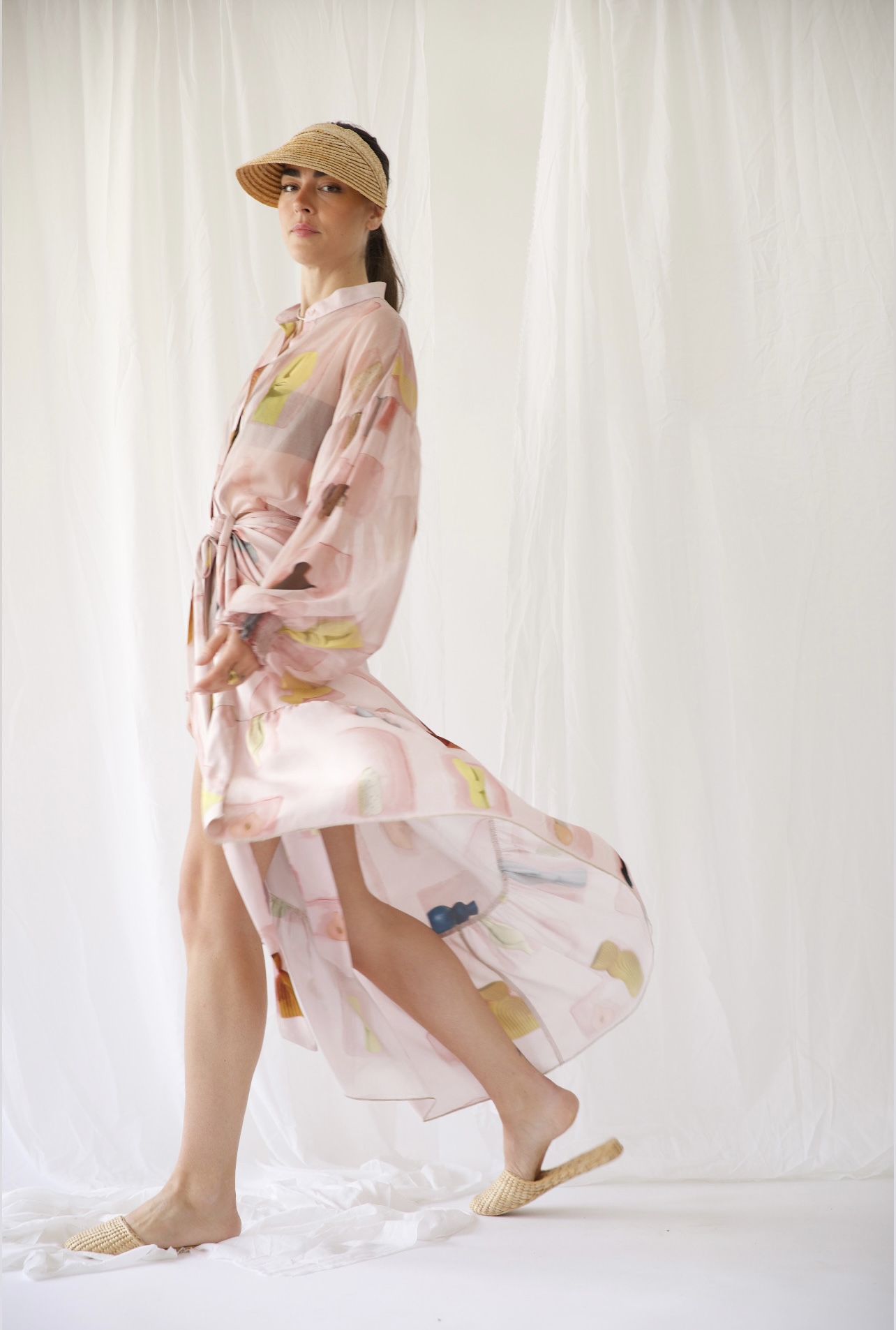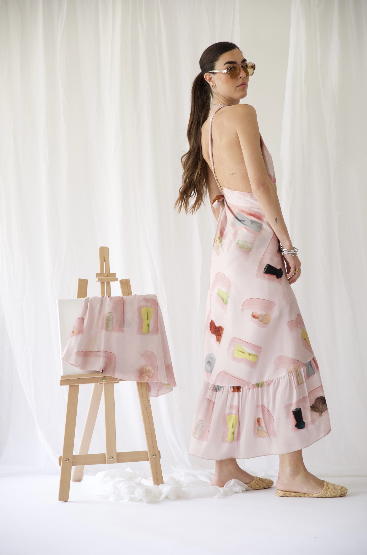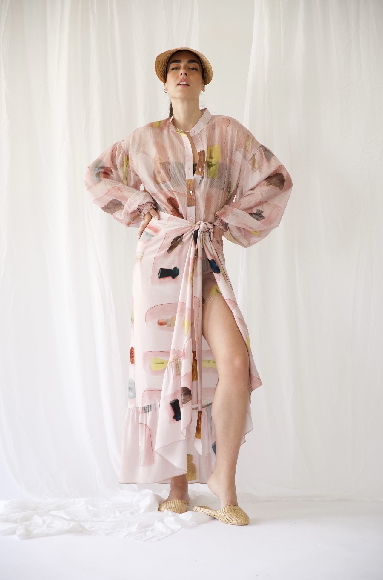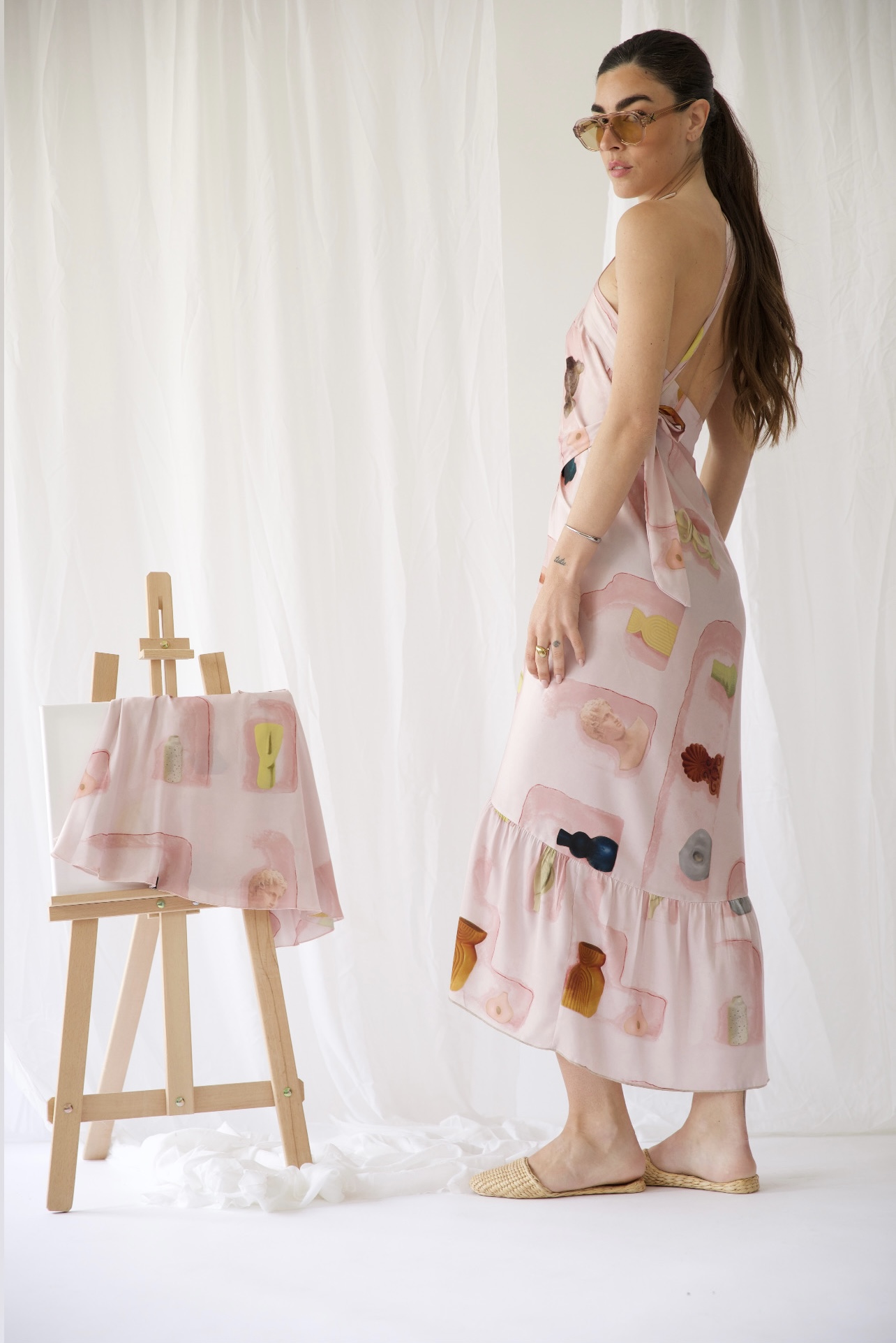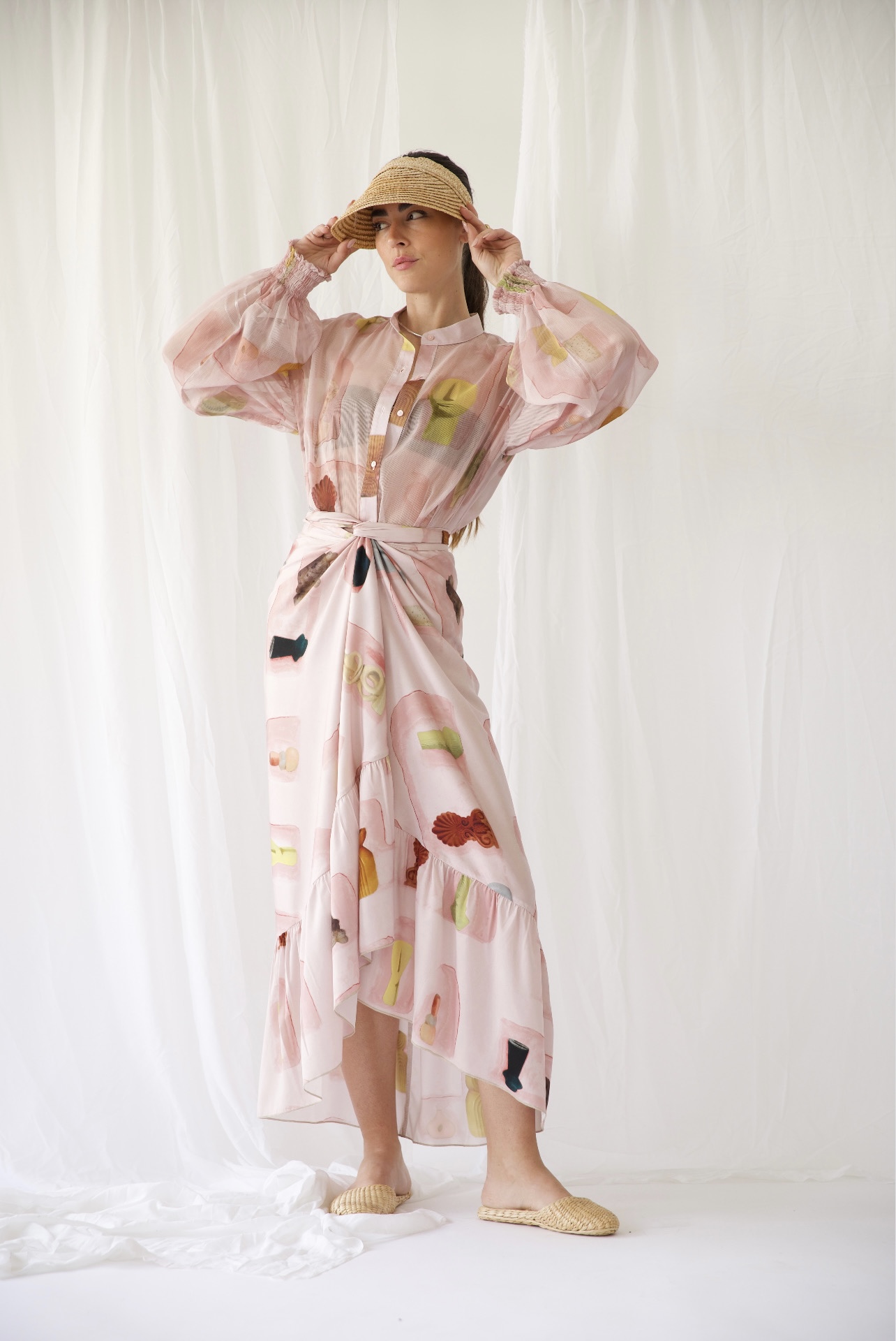 Flow polymorphic and convertible wrap skirt in pale pink wall art, can be easily transformed into an amazing midi dress with one move! There are many ways to wear it, please improvise! Made from a flowy silky satin, has ties on both sides to wrap it around you and a frill on the lower part that gives an extra move to the whole look! The signature print elevates the garment! Wear it as the most disruptive stand-alone dress or with anything from a tank top to a matching shirt or top. Our wardrobes are often divided into “work” and “casual” but The KNLs creates versatile pieces as this convertible skirt that can be worn for both, and a variety of other occasions, too.