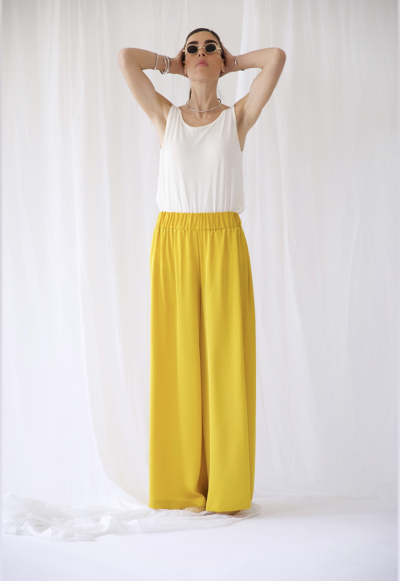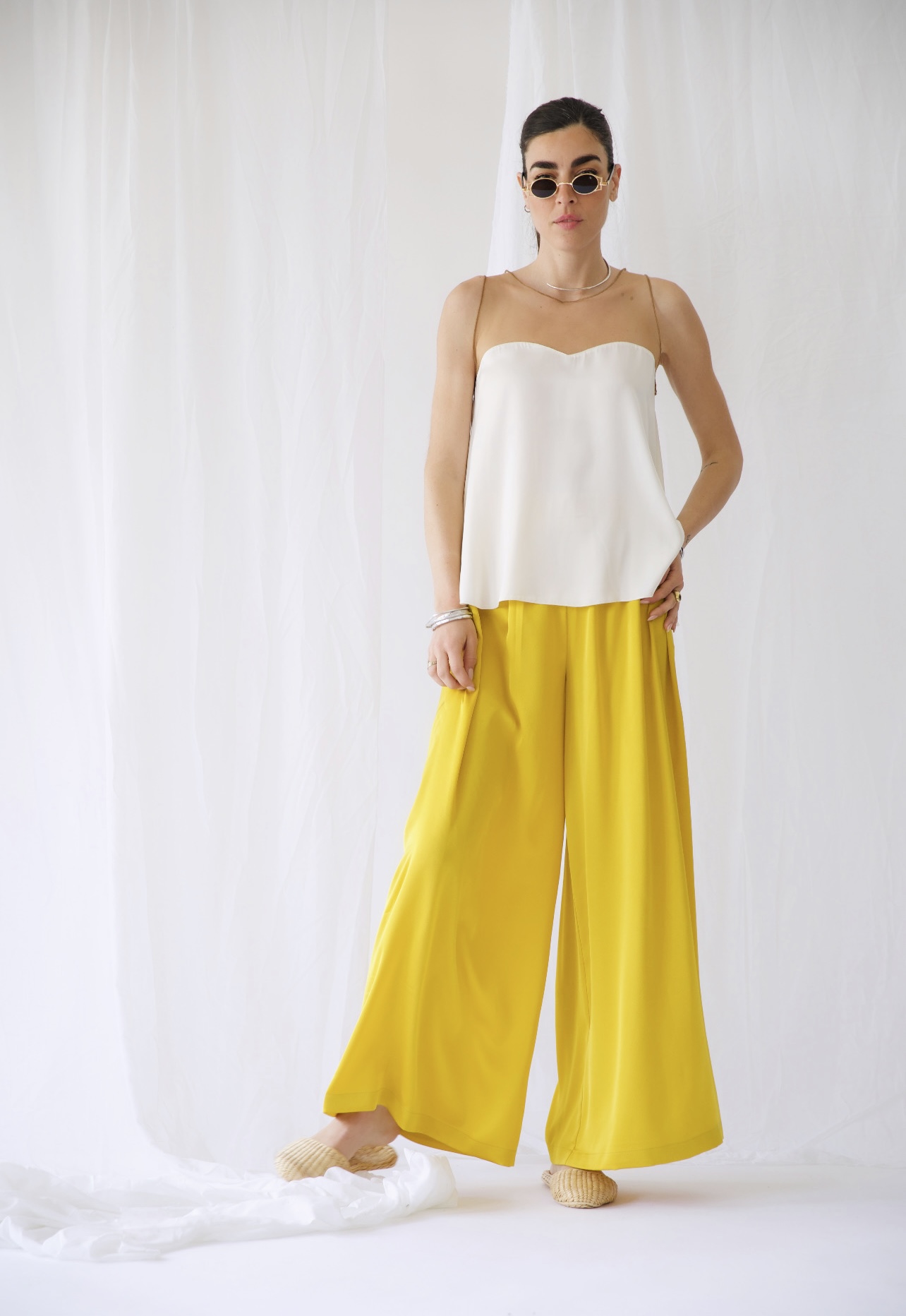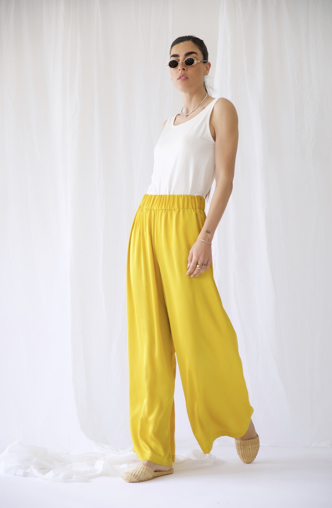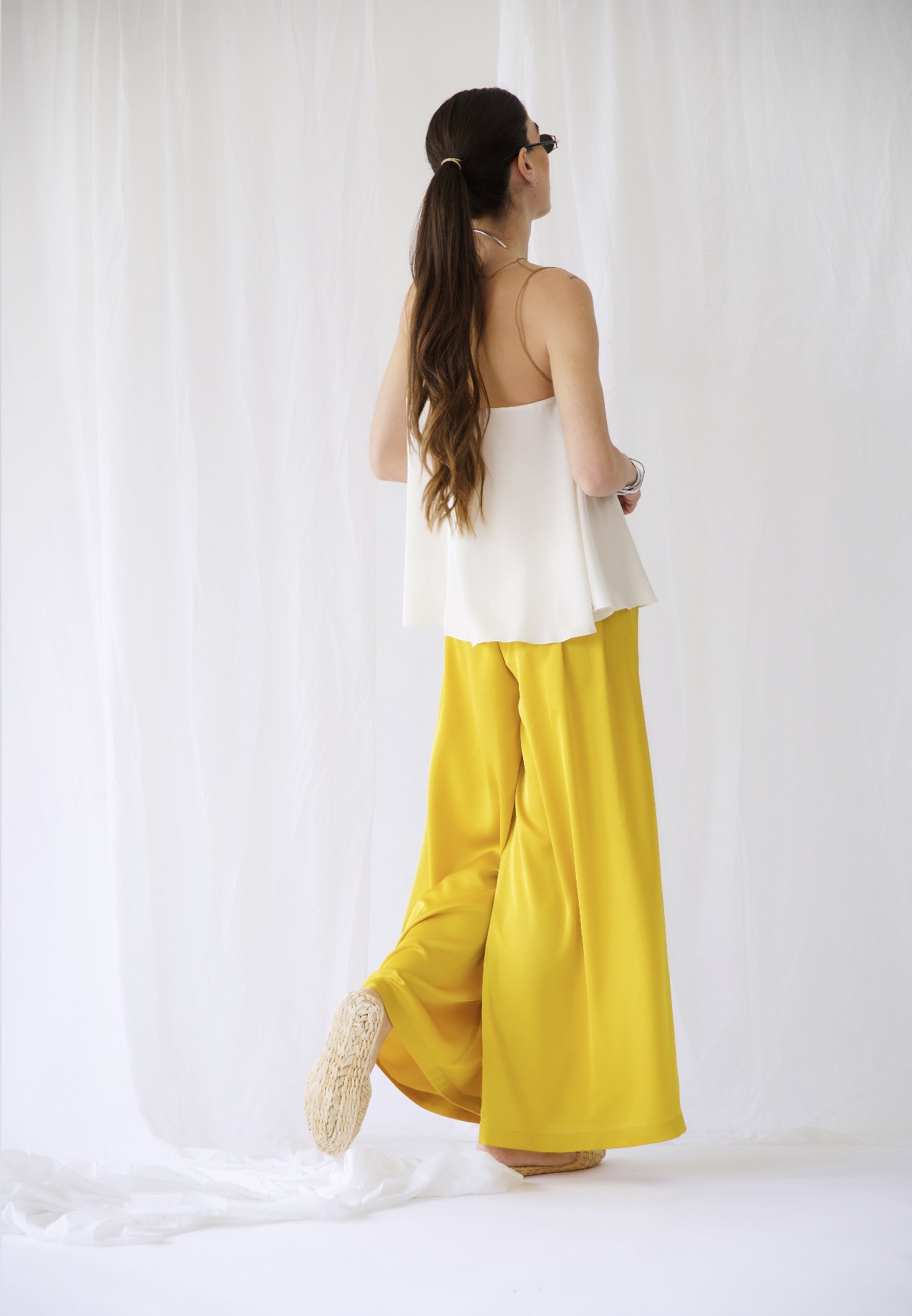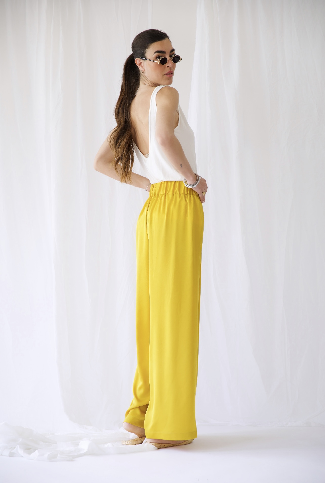 These wide leg yellow pants are easy-to-style, made from silk satin fabric and shaping a perfect silhouette that flatters every body type. Part of the suit with Anemoia blazer or a stand-alone piece, its ethereal feel and floaty look makes it perfect to wear for an occasion or at day for an official look. The flawless fabric moves beautifully as you walk, while it is made ethically. Wear it with a chic blouse high waisted or lower at the hips.