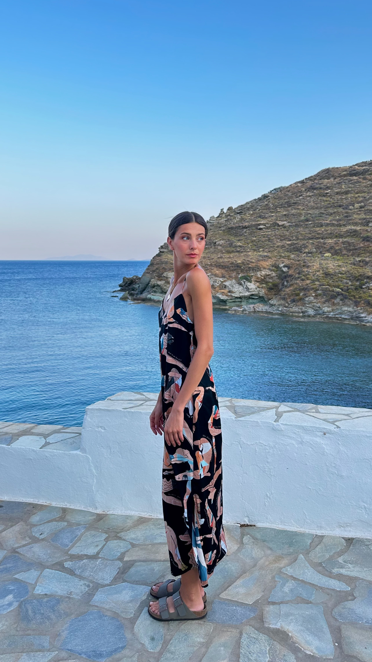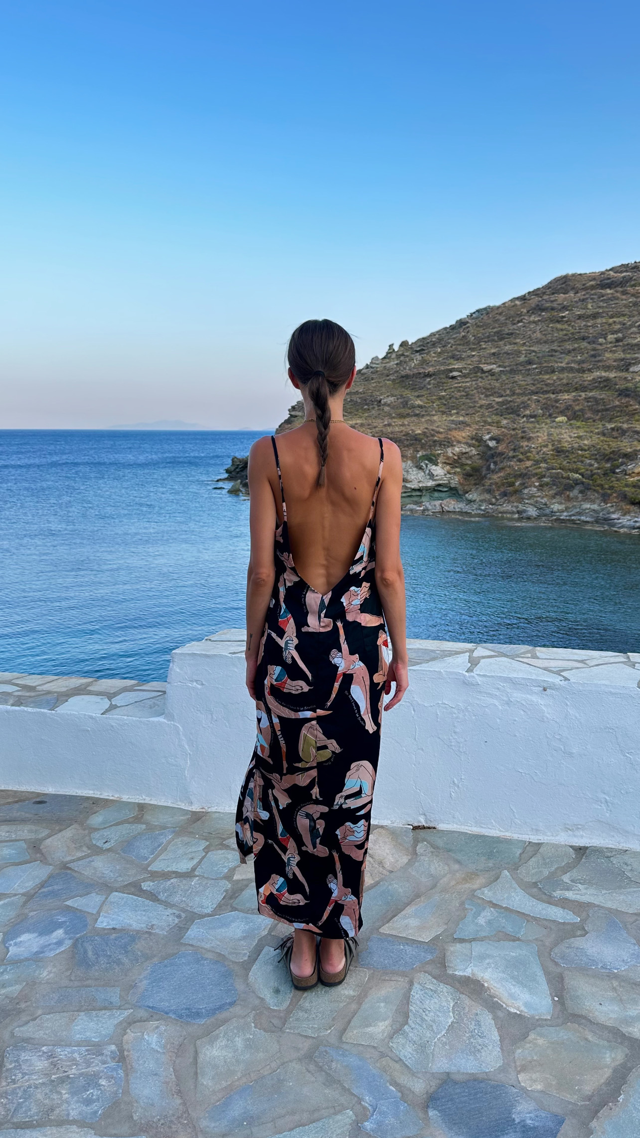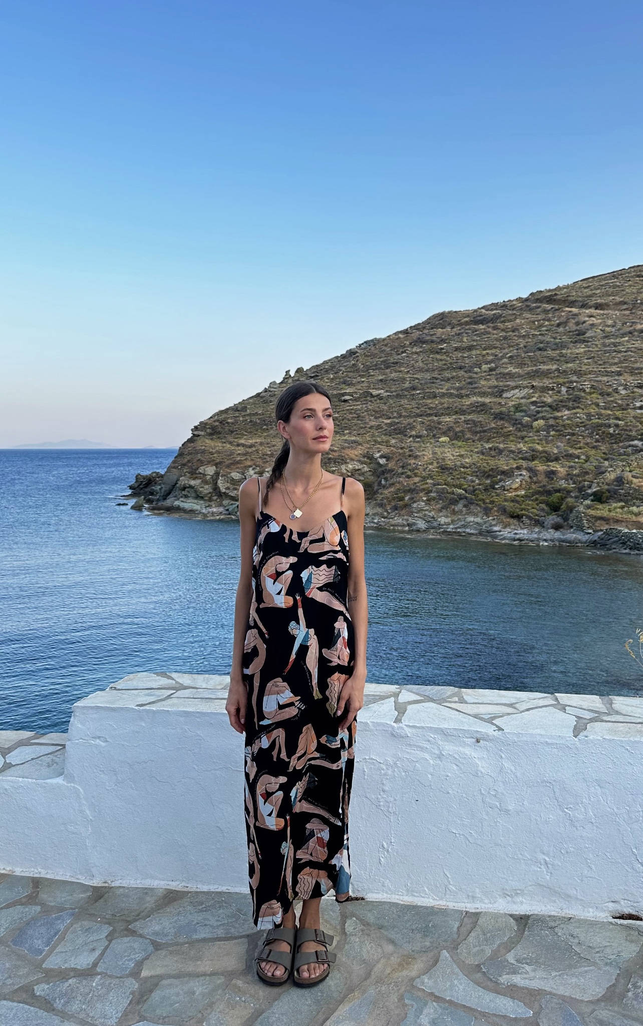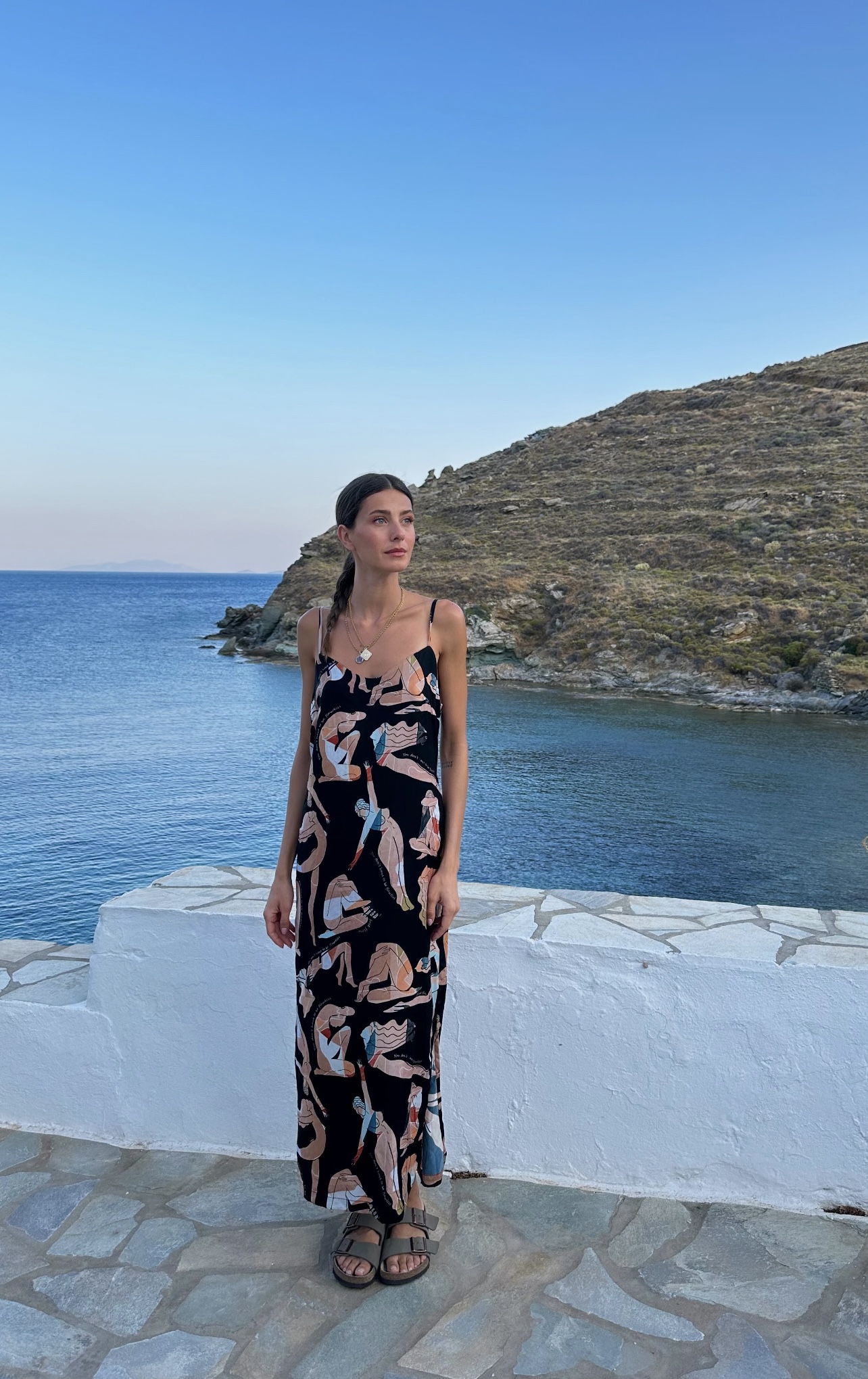 Retreat silky midi dress with signature print Black flow girls has a simple and sexy style you don’t want to miss. Flawlessly crafted with delicate details it has a fluid design and a low sexy back to reveal. It comes with V neckline, shoulder straps and a cloche line, this black dress with one side leg cut out and loose fit for maximum comfort, is the absolute all day to party dress saver. You will adjust it on the body with ease, its non-transparent fabric ensures absolute coverage on summer days. A black strappy midi dress you will reach for time and time again. Pair the look with strappy heels and a chic clutch.