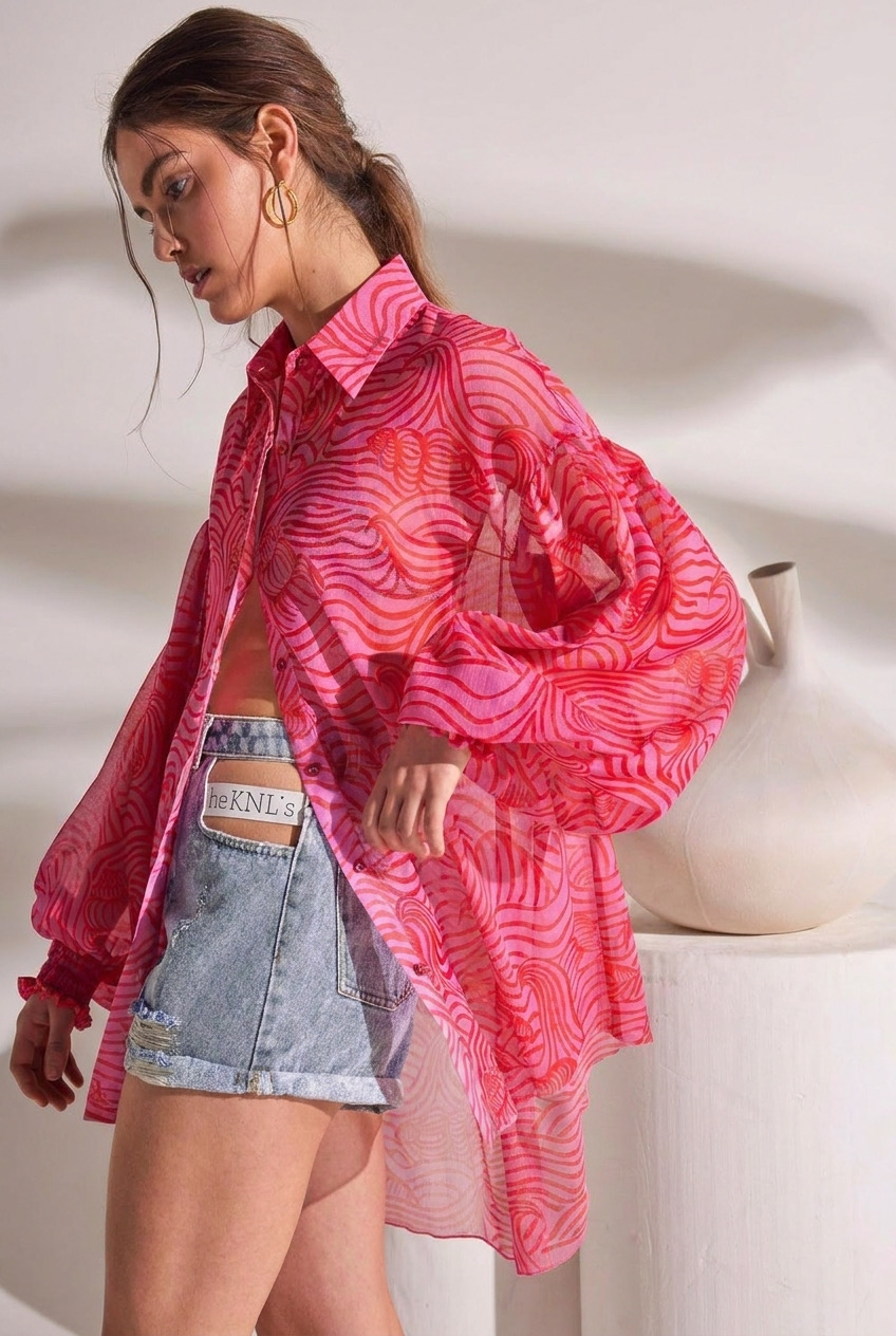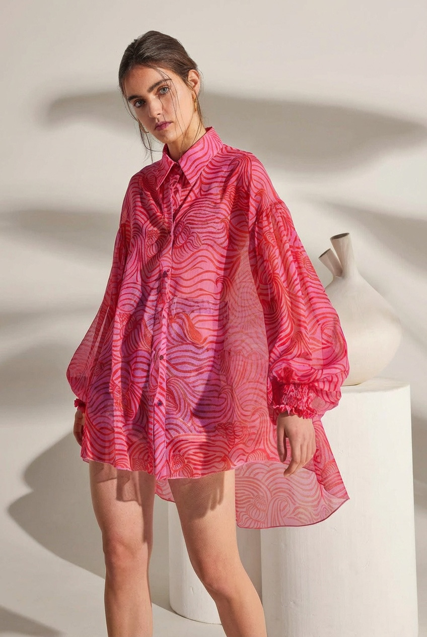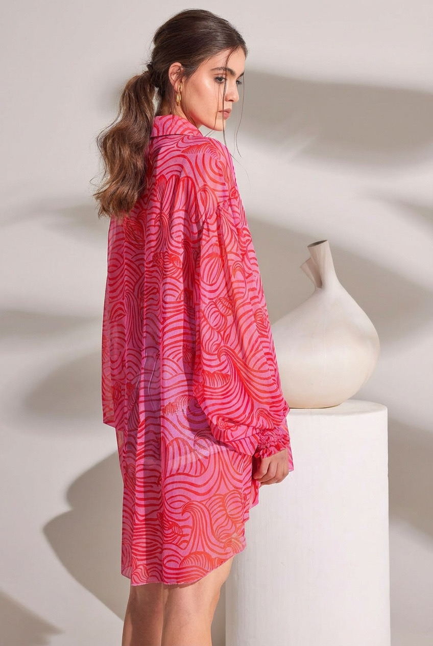 Mosaic silk tunic in pink encapsulates the effortlessly cool spirit of comfort dressing. Its ethereal and floaty silk look and feel feature bold, minimal, preppy style. The hand printed saturated pattern is an inspiration from retro summer in Greece design. With those loose sleeves and semi-transparent silk chiffon fabric, you can wear the hot pink down lapel shirt with shorts over your jeans or stand-alone over your swimsuit. Comes in one size to fit every body type! You will love it!