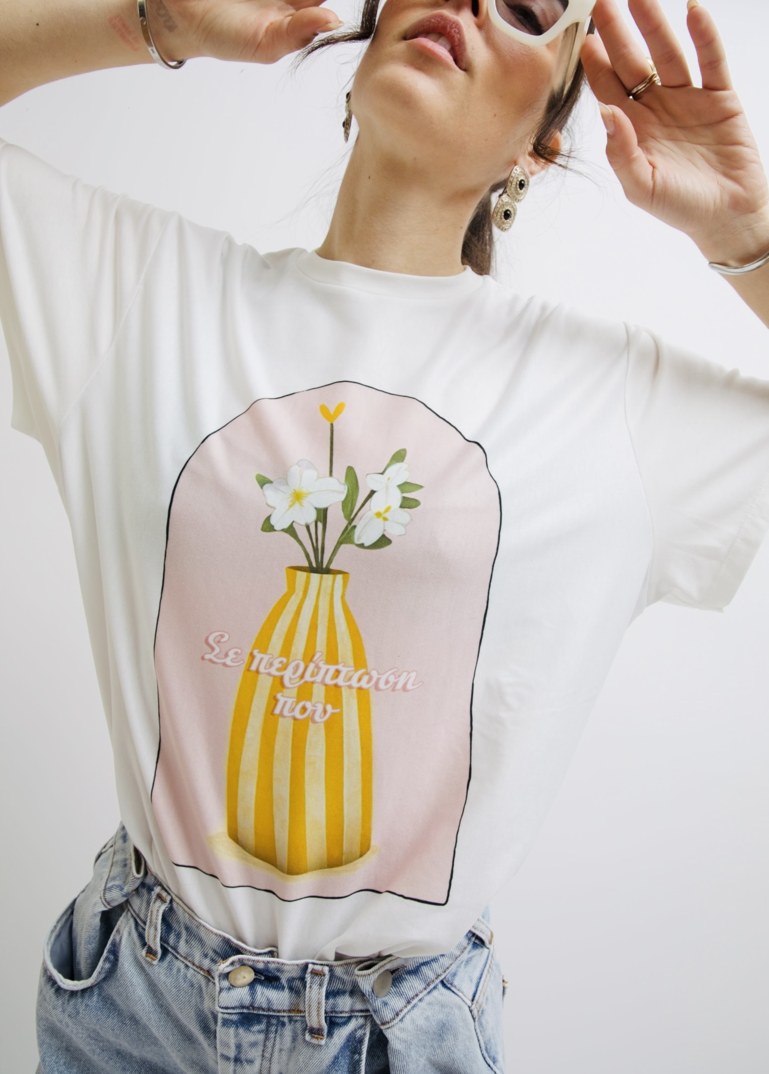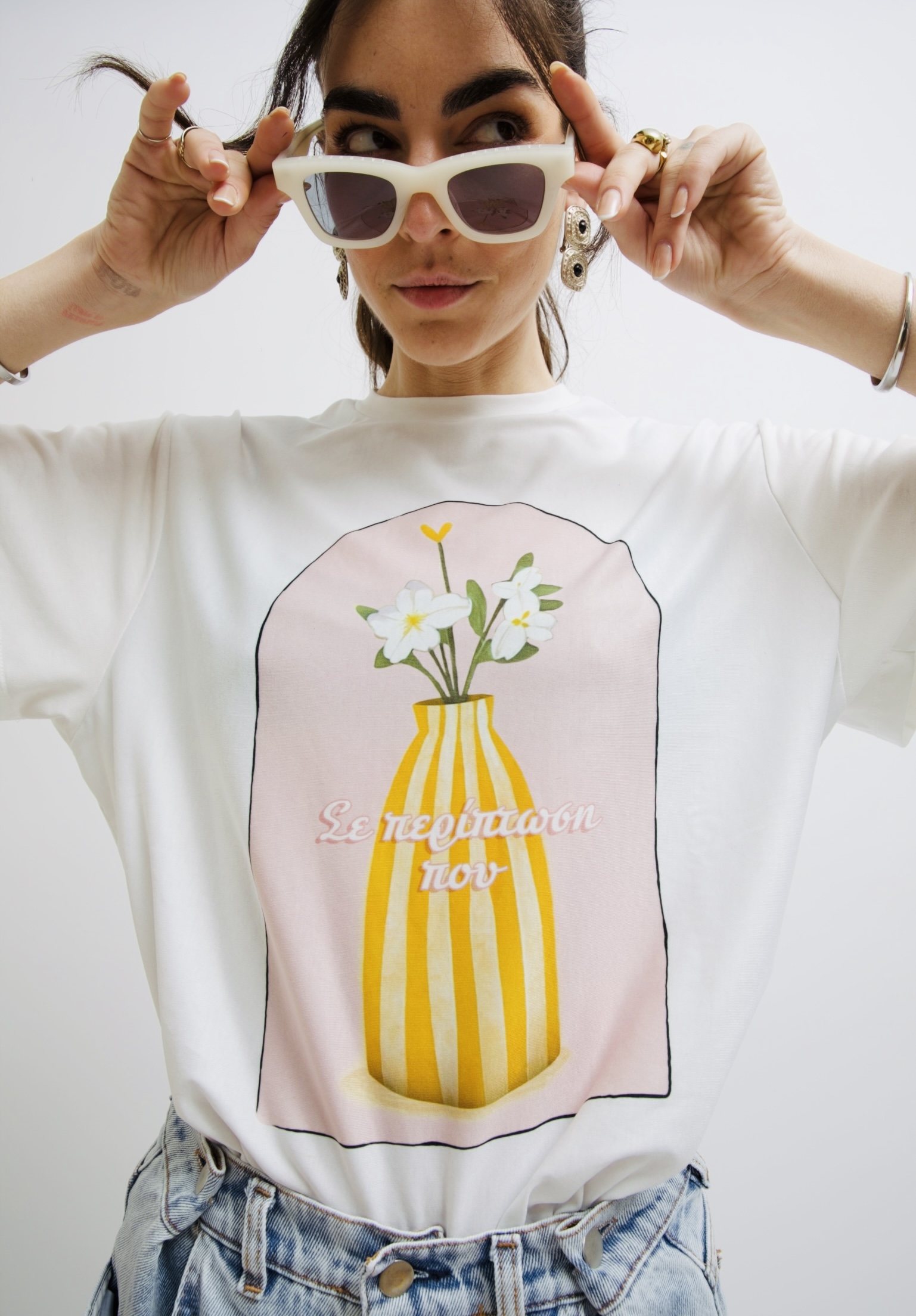 Unisex t-shirt printed with jasmine “se periptosi pou” quote signature pattern. It is all about chances! Make a Manifestation with our Manifest unisex digital printed t-shirt. Colourful with the sound of a song and the smell of a flower, unique with your feelings on it it features the signature print of the season, a tribute to manifest that you just flow and you don’t have to be flawless in a print from the painted «Γιασεμί» KNLs. Made from modal-cotton, the oversized piece has a loose, boyish fit and a round neck. Unisex t-shirt printed hug. A t-shirt that stands out with the KNLs art and logo. The ideal choice for you and your boyfriend. Fits any man and woman body type as it is comfortable and breezy. Wear it with shorts and jeans.